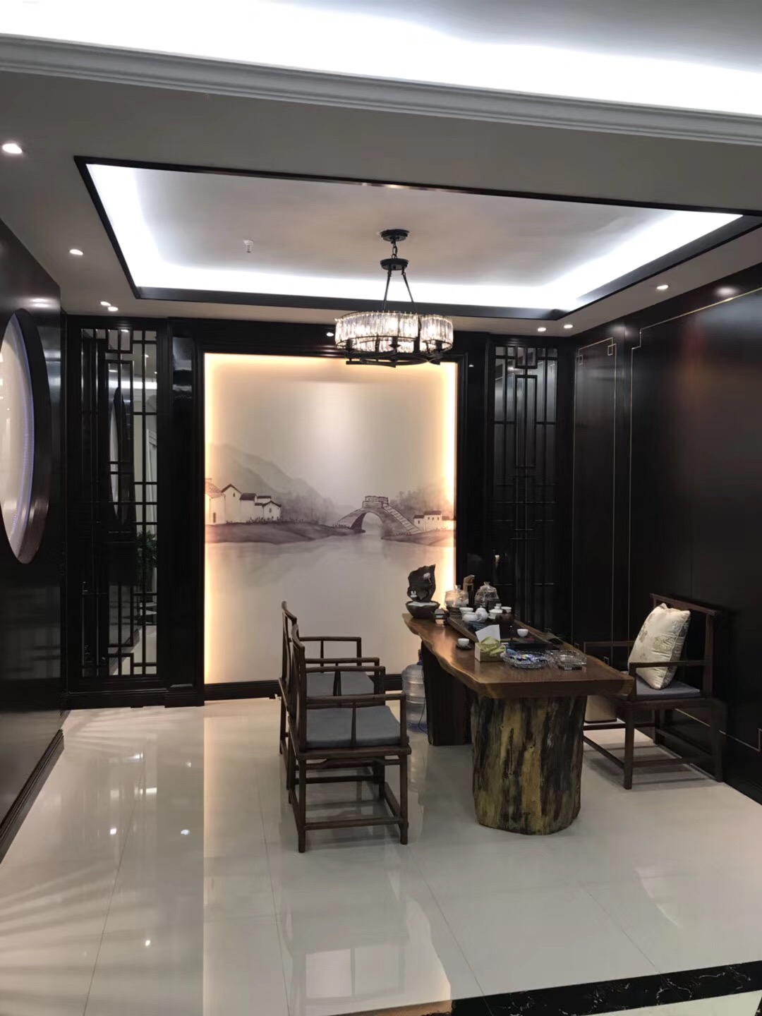 深灰色的木皮整体的感觉更加的低调和优雅,有着中式的内敛含蓄之感。亮光漆的运用,一方面可以提升空间亮度,削弱灰色带来的沉闷压抑,另一方面也增加了整个设计的时尚度。